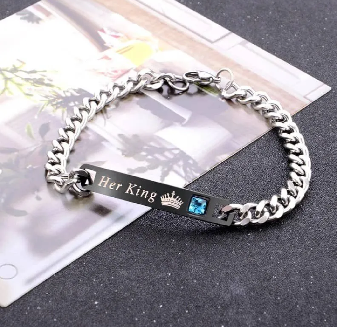 Premium stainless steel men’s bracelet with “Her King” engraving & crown design.